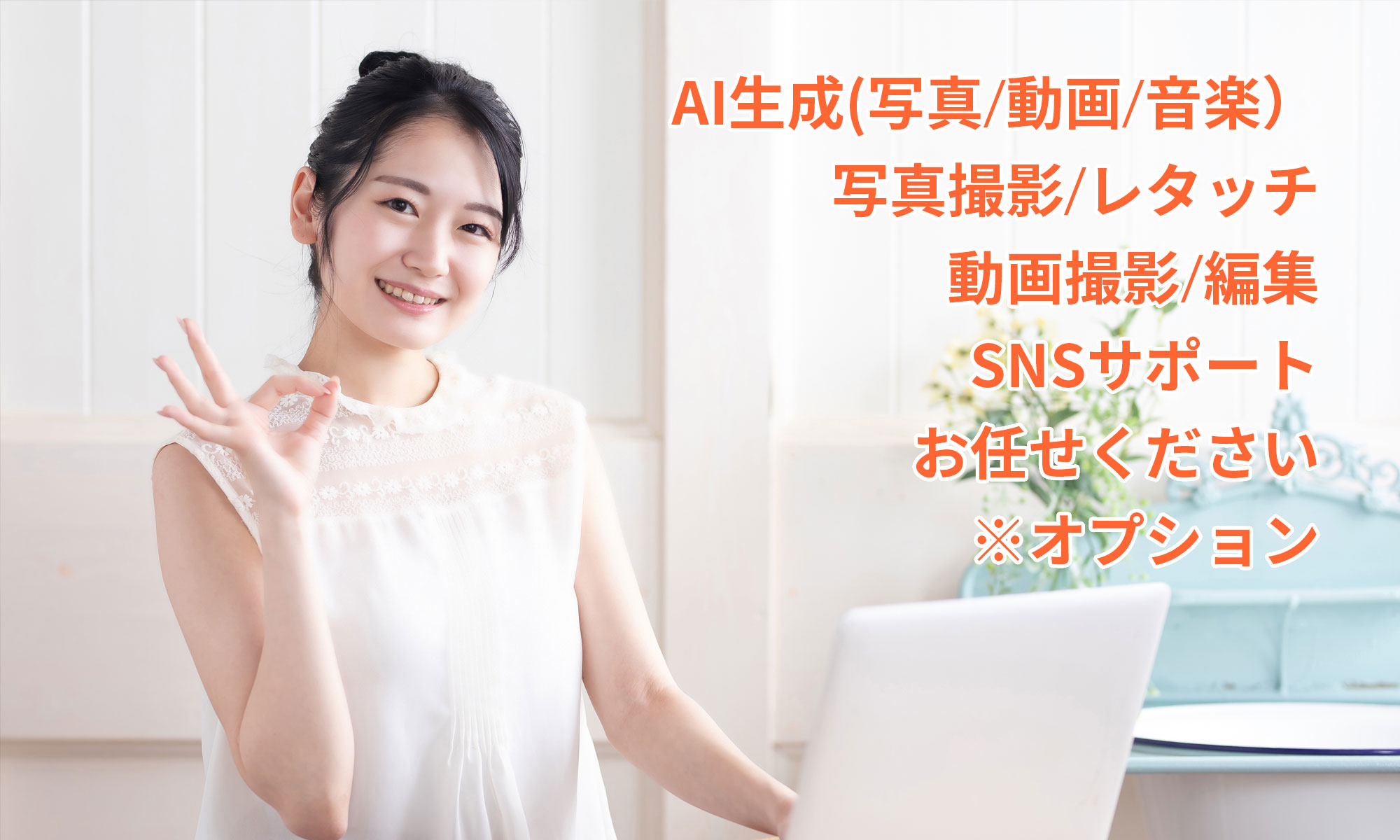 AI生成(写真/動画/音楽)、写真撮影/レタッチ、動画撮影/編集、SNSサポートもお任せください。